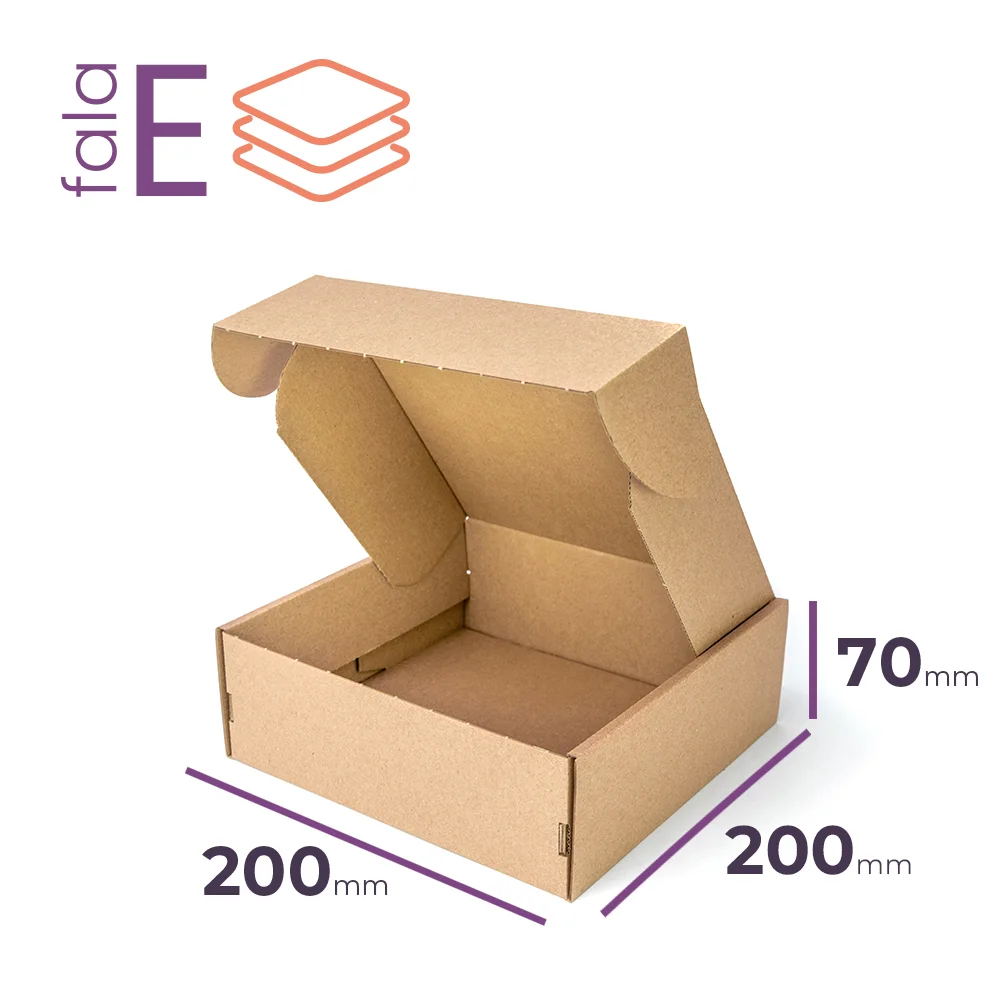 Szare pudełko fasonowe o wymiarach wewnętrznych 200x200x70 mm. Wykonane z tektury 3-warstwowej o fali E - gramatura 360 g/m2. Max. pojemność 2,8 L. Karton wykonany w 100% z materiałów biodegradowalnych i posiada certyfikat FSC®.