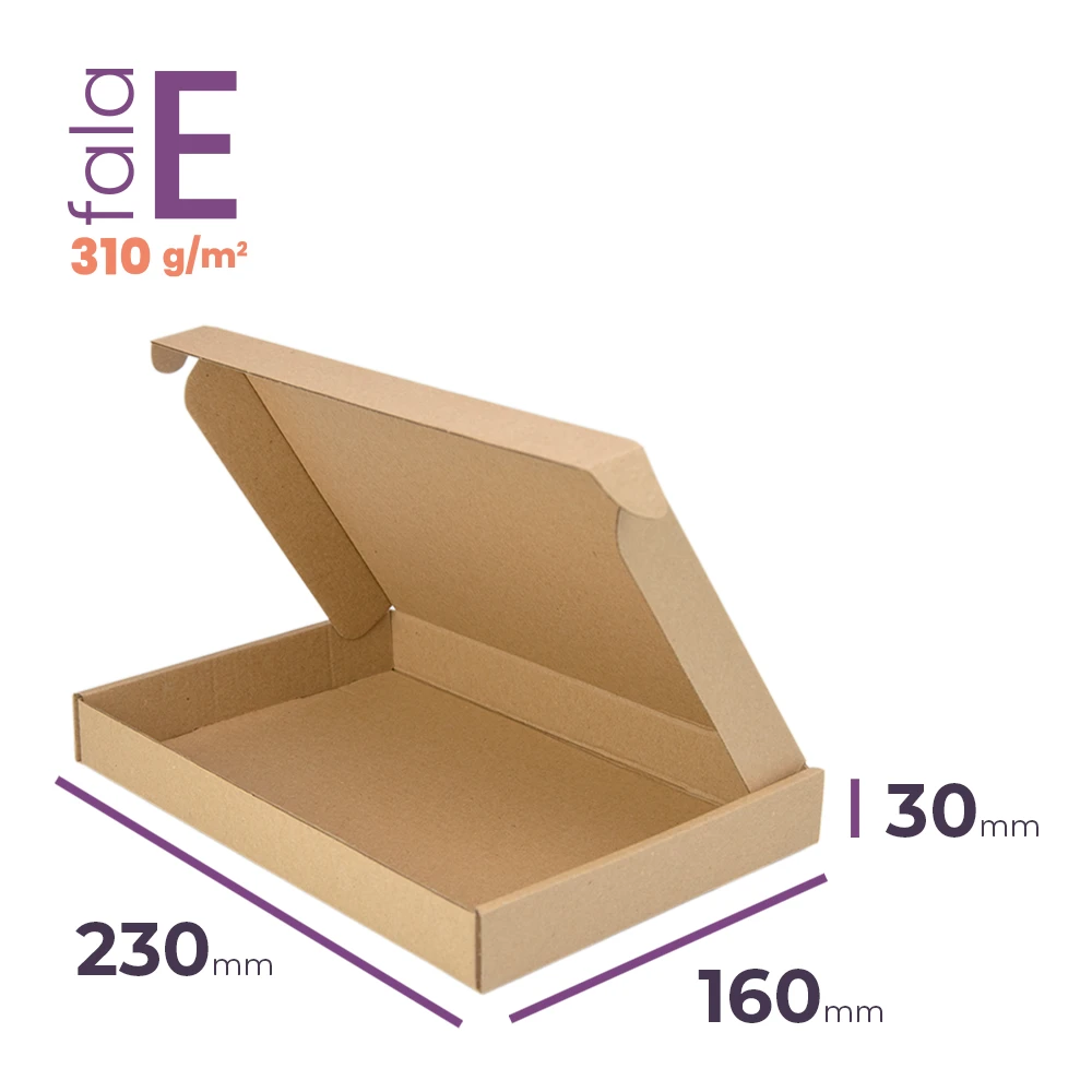Karton gabaryt XS o wymiarze zewnętrznym 230x160x30 mm z tektury o fali E i gramaturze 310 g/m2, świetnie zabezpiecza wysyłane lub przechowywane produkty, a dodatkowo wygląda niezwykle estetycznie ze względu na swoją specyfikę zamykania oraz brak konieczności używania taśmy klejącej. Będzie to idealny karton na materiały reklamowe i katalogi, które należy odpowiednio zapakować, aby nie uległy zniszczeniu. Co więcej zmieszczą się w nim również przedmioty, takie jak biżuteria, kosmetyki oraz niektóre akcesoria GSM. Dzięki bardzo łatwemu sposobowi składania, opakowanie jest praktycznym i niezwykle ekonomicznym wyborem dla sklepów internetowych, które chcą zoptymalizować swoje działania i wydatki.