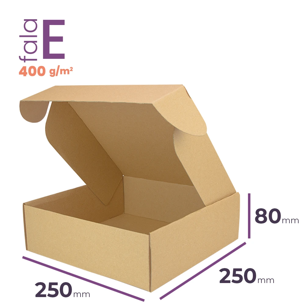 Szare pudełko fasonowe o wymiarach zewnętrznych 250x250x80 mm. Wykonane z tektury 3-warstwowej o fali E - gramatura 400 g/m2. Max. pojemność 4,36 L. Karton wykonany w 100% z materiałów biodegradowalnych i posiada certyfikat FSC®.