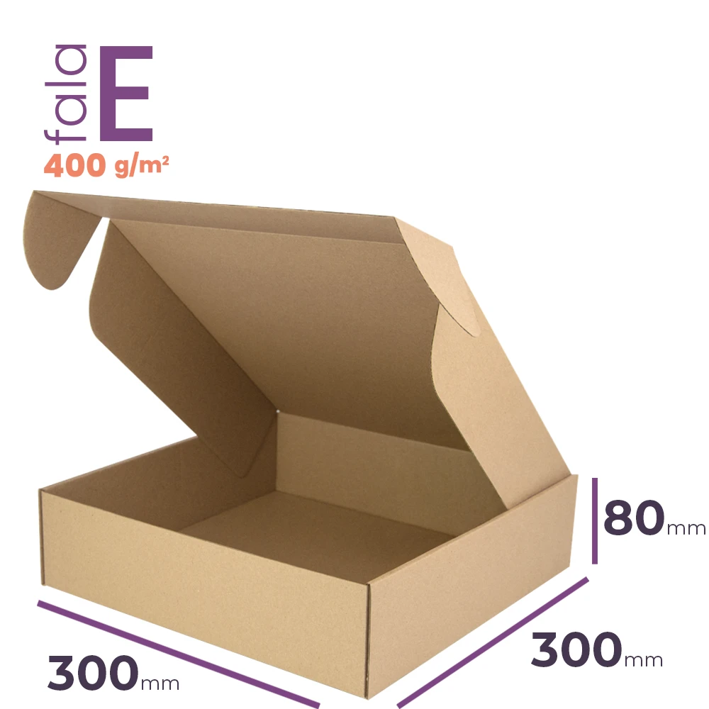 Szare pudełko fasonowe o wymiarach zewnętrznych 300x300x80 mm. Wykonane z tektury 3-warstwowej o fali E - gramatura 400 g/m2. Max. pojemność 6,37 L. Karton wykonany w 100% z materiałów biodegradowalnych i posiada certyfikat FSC®.