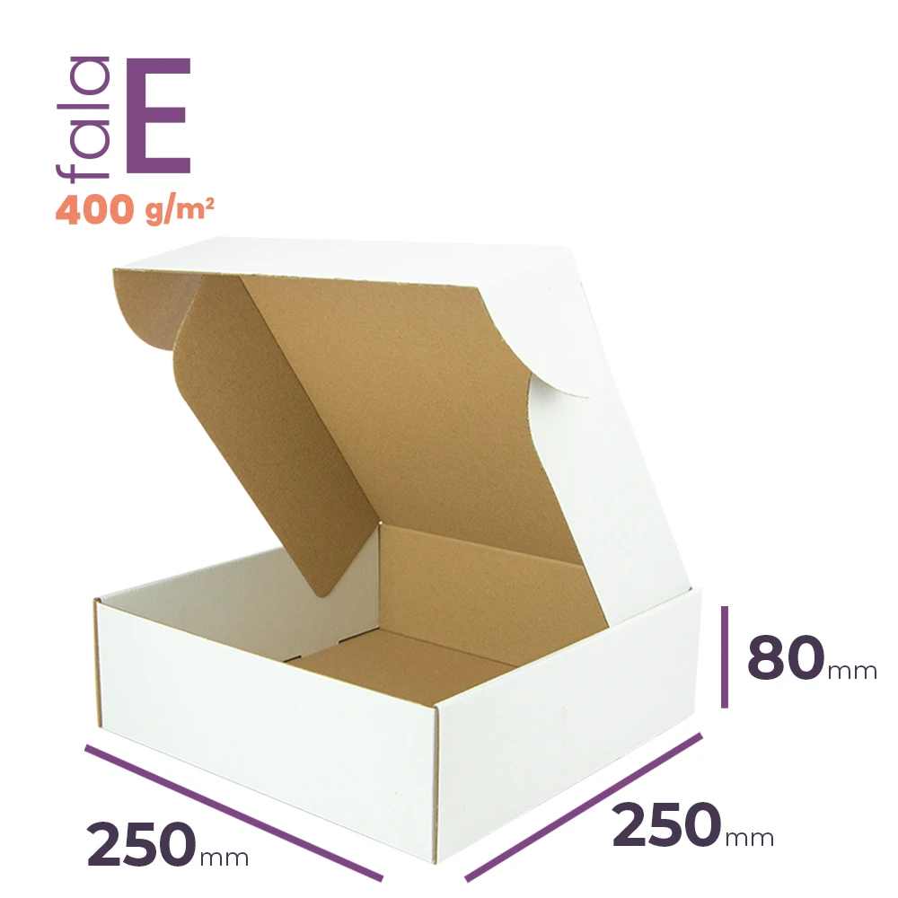 Białe pudełko fasonowe o wymiarach zewnętrznych 250x250x80 mm. Wykonane z tektury 3-warstwowej o fali E - gramatura 400 g/m2. Max. pojemność 4,36 L. Karton wykonany w 100% z materiałów biodegradowalnych i posiada certyfikat FSC®.