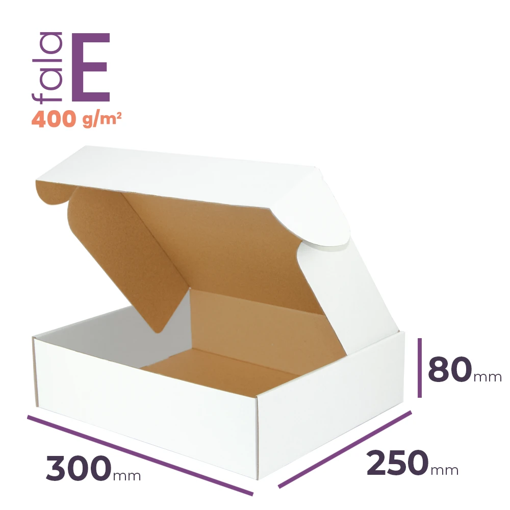 Białe pudełko fasonowe o wymiarach zewnętrznych 300x250x80 mm. Wykonane z tektury 3-warstwowej o fali E - gramatura 400 g/m2. Max. pojemność 5,29 L. Karton wykonany w 100% z materiałów biodegradowalnych i posiada certyfikat FSC®.