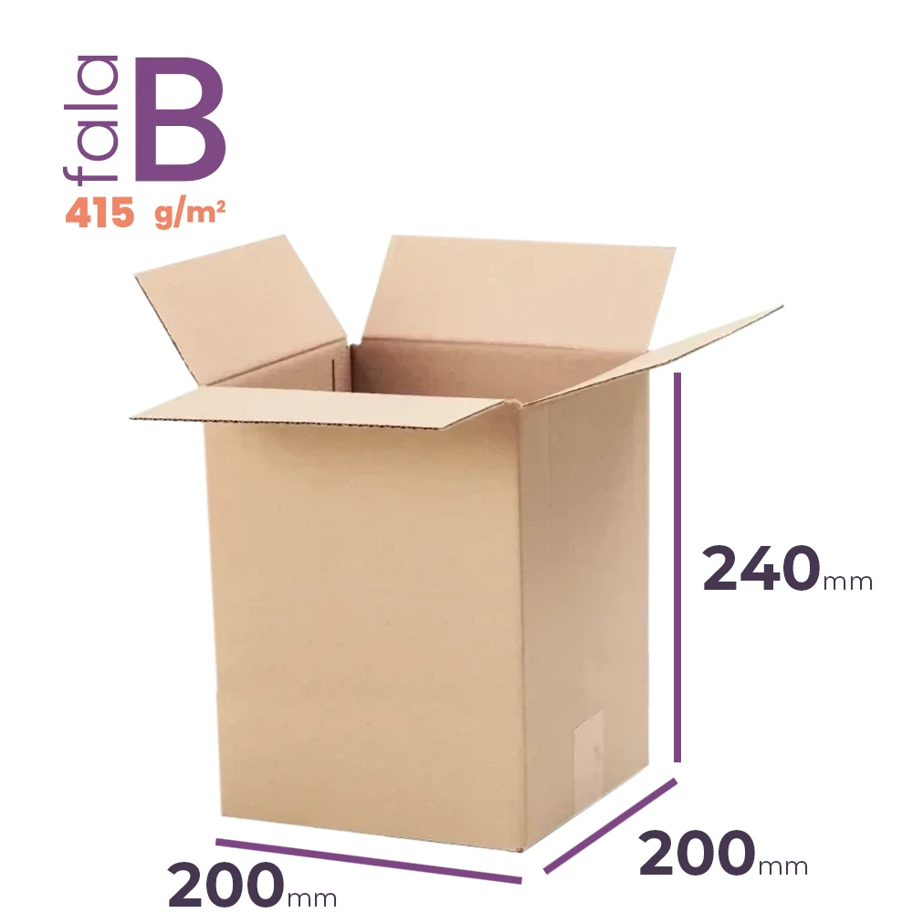 Karton klapowy o wymiarach zewnętrznych 200x200x240 mm to solidne i funkcjonalne opakowanie idealne do wysyłki cięższych i delikatnych przedmiotów. Wykonany z wytrzymałej 3-warstwowej tektury (fala B) o gramaturze 415g/m2, gwarantuje doskonałą ochronę zawartości. Karton zgodny z FEFCO 201, posiada certyfikat FSC.