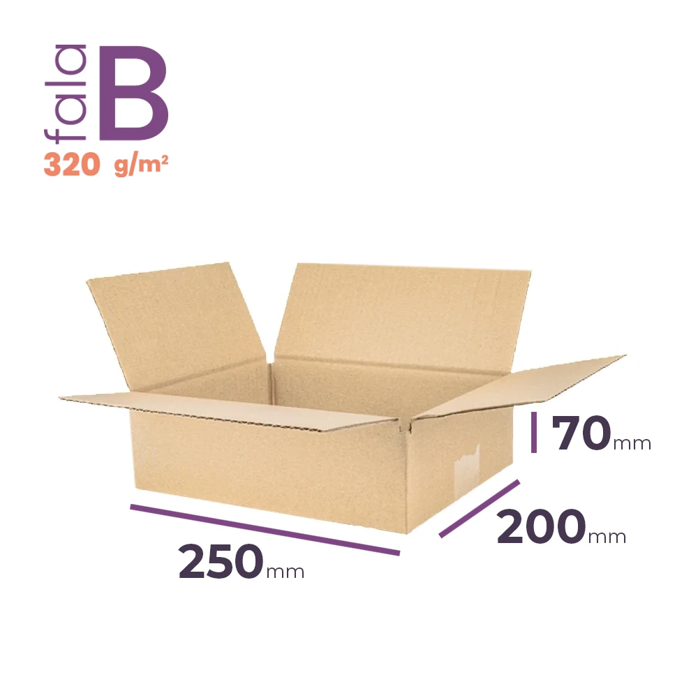 Karton klapowy o wymiarze zewnętrznym 250x200x70 mm to kompaktowe, ekologiczne małe pudełko kartonowe, idealne do pakowania lekkich i drobnych produktów. Wykonany z 3-warstwowej tektury (fala B, gramatura 320g/m2) i posiadający certyfikat FSC, łączy trwałość z troską o środowisko. Jego niewielka wysokość i poręczny format sprawiają, że mieści się w najniższych gabarytach przesyłek: gabaryt A InPost, S Orlen Paczka, S Pocztex, S DHL oraz pasuje do automatu DPD.