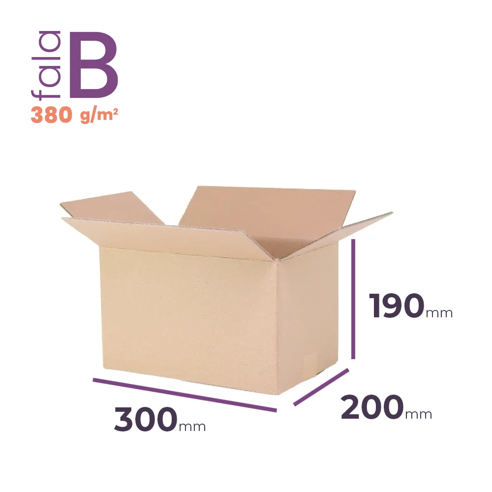 Karton klapowy o wymiarach zewnętrznych 300x200x190 mm to kompaktowe małe pudełko kartonowe, stworzone z myślą o bezpiecznym pakowaniu i wysyłce drobnych przedmiotów. Wykonany z 3-warstwowej tektury (fala B, gramatura 380 g/m2), posiada certyfikat FSC, co świadczy o jego ekologicznym pochodzeniu. Karton pasuje do najpopularniejszych gabarytów kurierskich: gabaryt B InPost, M Orlen Paczka, M Pocztex, M DHL, a także do automatu DPD.