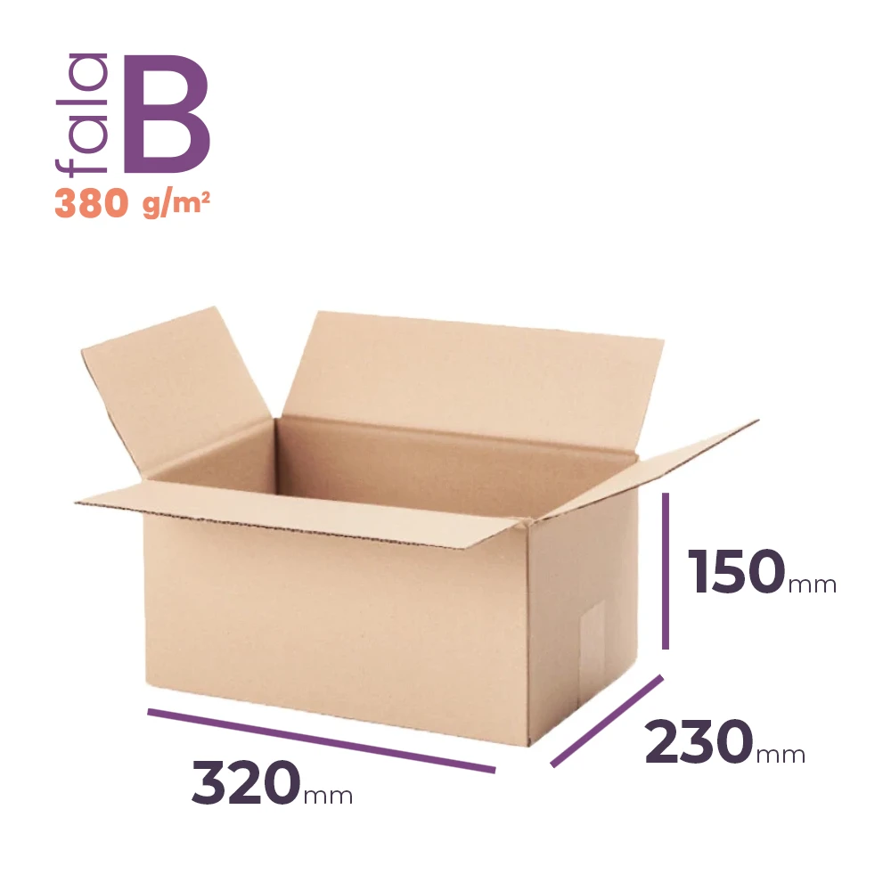 Karton klapowy o wymiarach 320x230x150 mm (wymiar zewnętrzny) to funkcjonalne, trwałe i ekologiczne opakowanie (certyfikat FSC), które doskonale sprawdza się w wysyłce mniejszych i delikatnych przedmiotów. Wykonany z 3-warstwowej tektury (fala B, gramatura 380 g/m2), karton ten gwarantuje odpowiednią ochronę zawartości w transporcie oraz estetyczny wygląd przesyłki.
