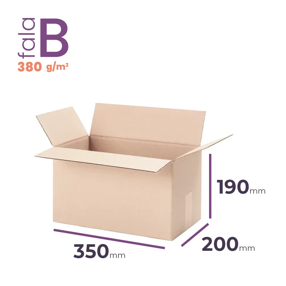 Karton klapowy 350x200x190 mm (wymiar zewnętrzny) to praktyczne opakowanie idealne do codziennego użytku w e-commerce. Wykonany z trwałej 3-warstwowej tektury (fala B, gramatura 380 g/m2), łączy w sobie funkcjonalność, trwałość i ekologiczne pochodzenie – potwierdzone certyfikatem FSC. Jego format doskonale wpisuje się w wymagania popularnych firm kurierskich – spełnia normy dla gabarytu B InPost, M Orlen Paczka, M Pocztex, M DHL, a także pasuje do automatu DPD.