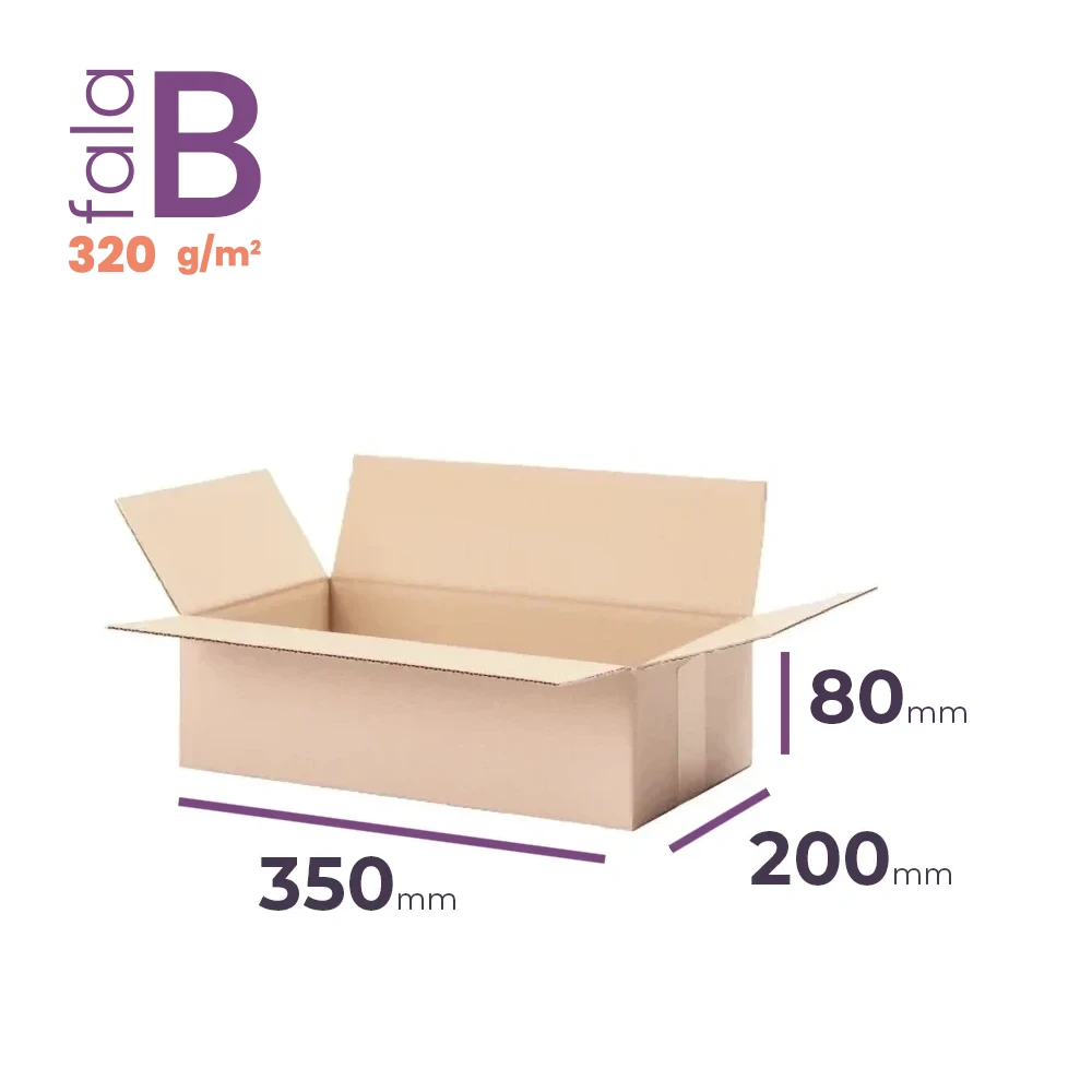 Karton klapowy 350x200x80 mm (wymiar zewnętrzny) to praktyczne opakowanie idealne do codziennego użytku w e-commerce. Wykonany z trwałej 3-warstwowej tektury (fala B, gramatura 320 g/m2), łączy w sobie funkcjonalność, trwałość i ekologiczne pochodzenie – potwierdzone certyfikatem FSC.
