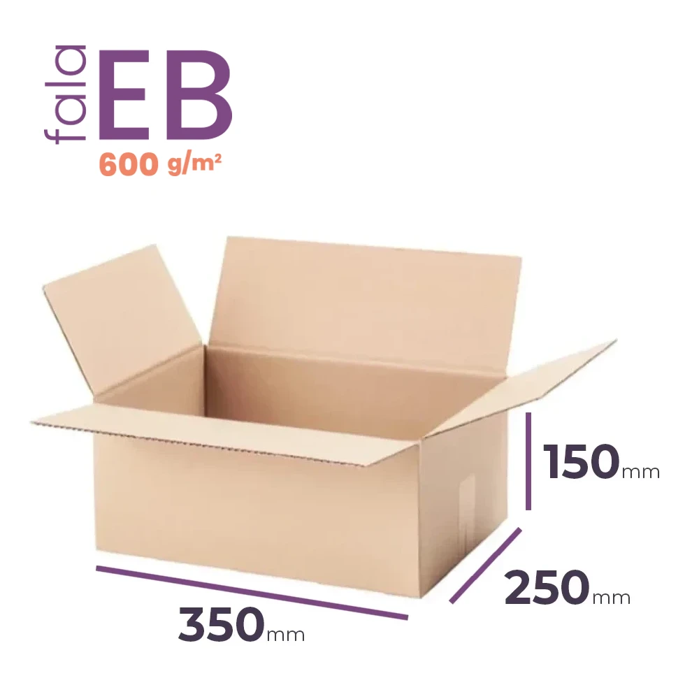 Karton klapowy 350x250x150 mm (wymiar zewnętrzny) to praktyczne opakowanie idealne do codziennego użytku w e-commerce. Wykonany z solidnej 5-warstwowej tektury (fala EB, wysoka gramatura 600 g/m2), łączy w sobie funkcjonalność, trwałość i ekologiczne pochodzenie – potwierdzone certyfikatem FSC. Jego format doskonale wpisuje się w wymagania popularnych firm kurierskich – spełnia normy dla gabarytu B InPost, M Orlen Paczka, M Pocztex, M DHL, a także pasuje do automatu DPD.