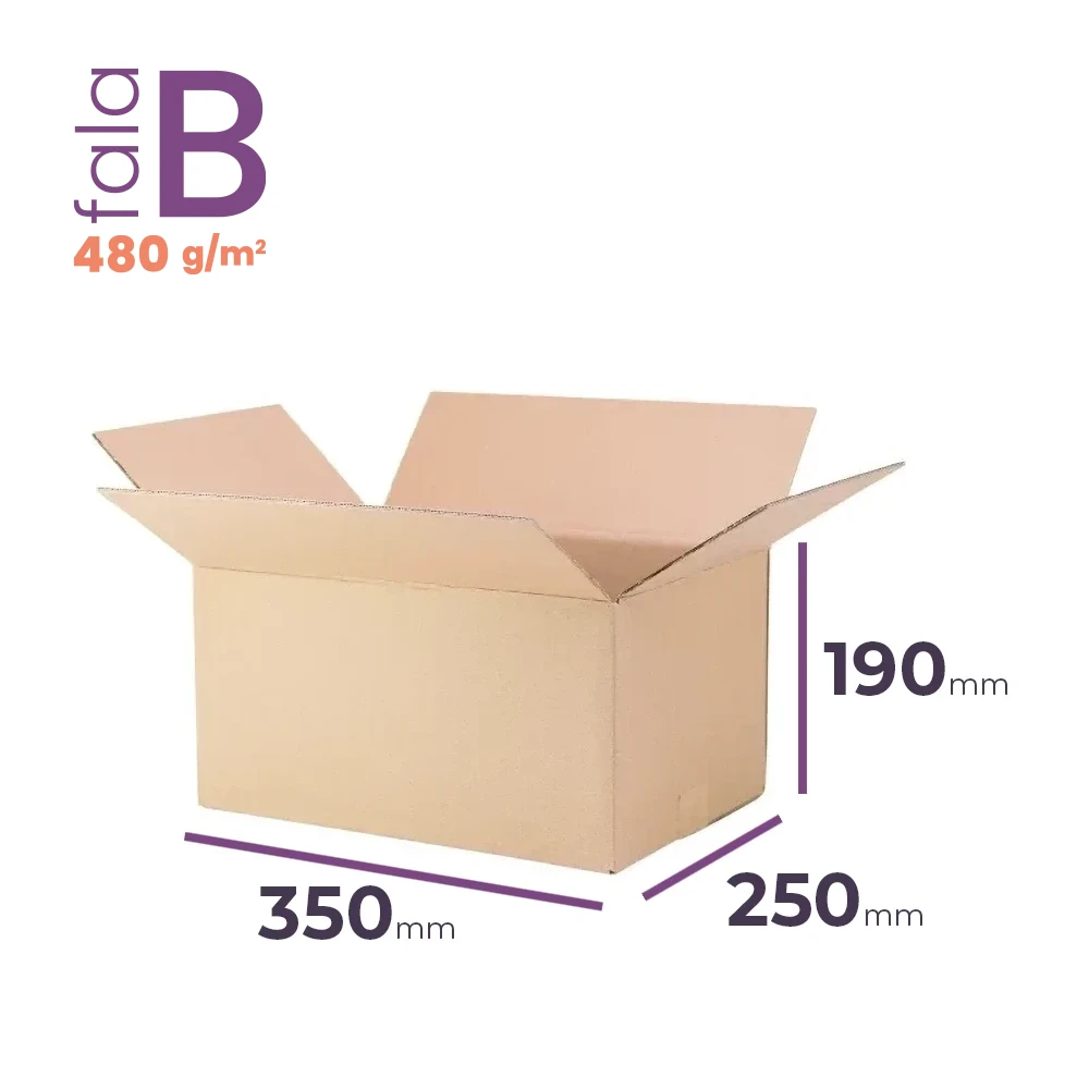 Karton klapowy o wymiarach zewnętrznych 350x250x190 mm to kompaktowe, funkcjonalne i ekologiczne małe pudełko klapowe przeznaczone do pakowania i wysyłki niewielkich przedmiotów. Wykonany z trwałej, 3-warstwowej tektury falistej (fala B, 480 g/m2), posiada certyfikat FSC. Mieści się w gabarytach B InPost, M Orlen Paczka, M Pocztex, M DHL i pasuje do automatu DPD.