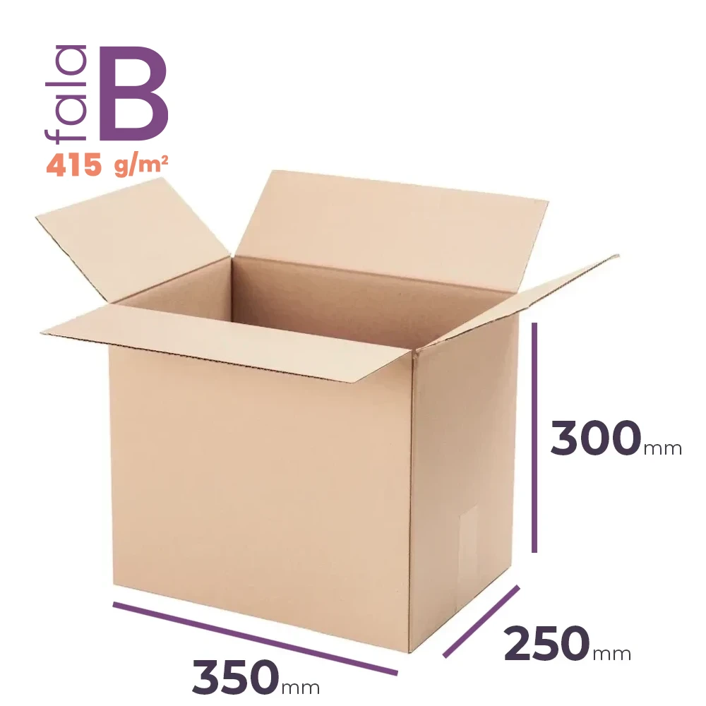 Karton klapowy 350x250x300 mm (wymiar zewnętrzny) to praktyczne opakowanie idealne do codziennego użytku w e-commerce. Wykonany z trwałej 3-warstwowej tektury (fala B, gramatura 415 g/m2), łączy w sobie funkcjonalność, trwałość i ekologiczne pochodzenie – potwierdzone certyfikatem FSC. Jego format doskonale wpisuje się w wymagania popularnych firm kurierskich – spełnia normy dla gabarytu C InPost, L Orlen Paczka, L Pocztex, L DHL, a także pasuje do automatu DPD.