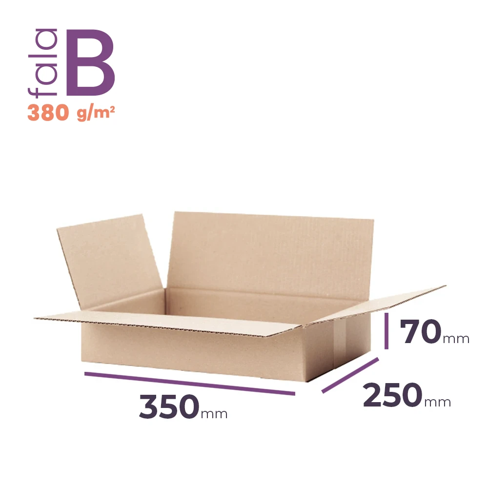 Karton klapowy o wymiarach zewnętrznych 350x250x70 mm to kompaktowe i solidne małe pudełko kartonowe, stworzone z myślą o bezpiecznym pakowaniu i wysyłce drobnych przedmiotów. Wykonany z 3-warstwowej tektury (fala B, gramatura 380 g/m2) posiada certyfikat FSC, co świadczy o jego ekologicznym pochodzeniu. Karton pasuje do najpopularniejszych gabarytów kurierskich: gabaryt A InPost, S Orlen Paczka, S Pocztex, S DHL, a także do automatu DPD.