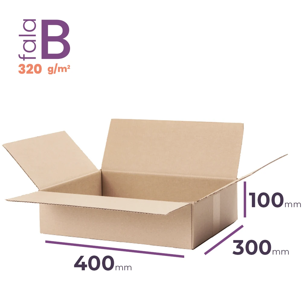 Uniwersalny karton średniej wielkości - 400x300x100 mm wykonany z tektury 3-warstwowej o fali B i gramaturze 320g/m2, pojemność 10,19 L to propozycja do wielu zastosowań - do wysyłki albumów, tekstyliów i bielizny, zmieści się do niego nawet małe AGD! Karton wykonany w 100% z materiałów biodegradowalnych i posiada certyfikat FSC®.