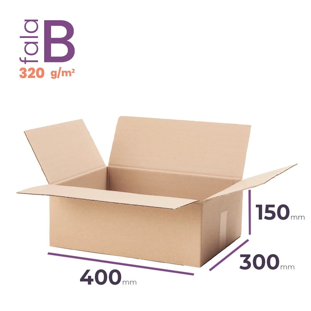 Średni karton wysyłkowy o wymiarach zewnętrznych 400x300x150 mm w fali B świetnie się sprawdzi w e-commersach odzieżowych, rozmiar bardzo dobrze pomieści większą ilość ubrań, dodatków a także obuwie. Wyślesz w nim także ręczniki, małe AGD czy większe opakowania kosmetyków.