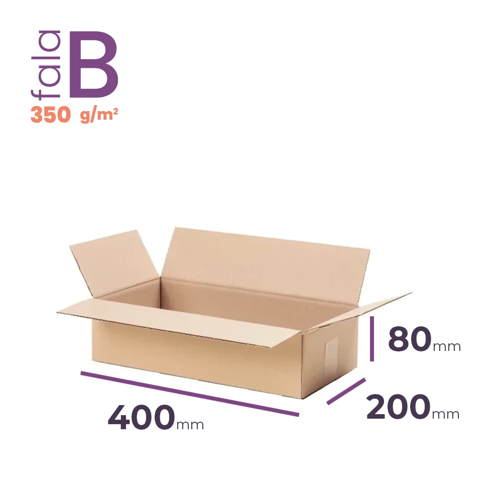 Karton klapowy o wymiarze zewnętrznym 400x200x80 mm to trwałe, ekologiczne i pojemne opakowanie, które idealnie sprawdzi się do wysyłki płaskich, średnich przedmiotów. Wykonany zgodnie z klasyfikacją FEFCO 201 z solidnej, 3-warstwowej tektury (fala B, gramatura 350 g/m2), karton ten zapewnia odporność na uszkodzenia mechaniczne. Produkt posiada certyfikat FSC, potwierdzający jego ekologiczne pochodzenie.