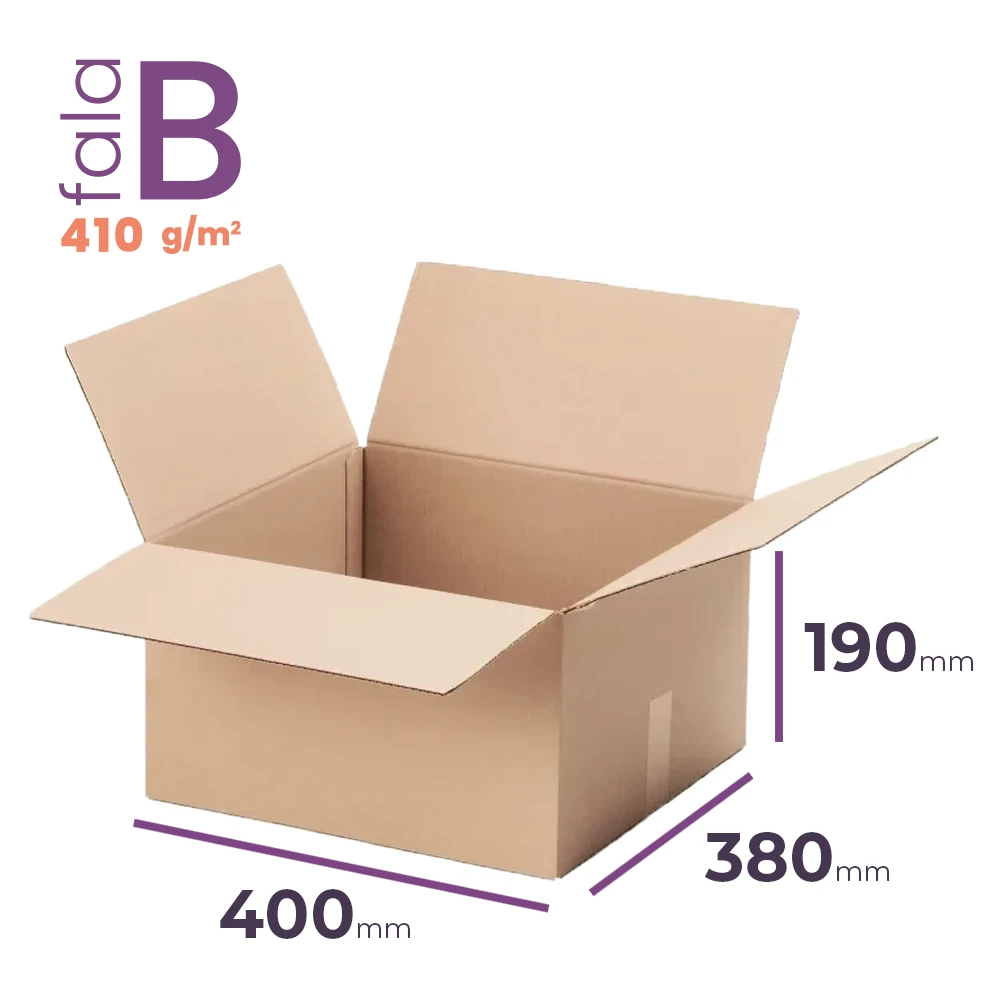 Szukasz solidnego opakowania do wysyłki średnich i delikatnych produktów? Karton klapowy o wymiarach 400x380x190 mm wykonany z tektury 3-warstwowej o fali B i wysokiej gramaturze 410 g/m2 z certyfikatem FSC, pojemności 26,39 litra to idealne rozwiązanie. Świetnie sprawdzi się w wysyłce akcesoriów domowych, średniego AGD oraz tekstyliów.