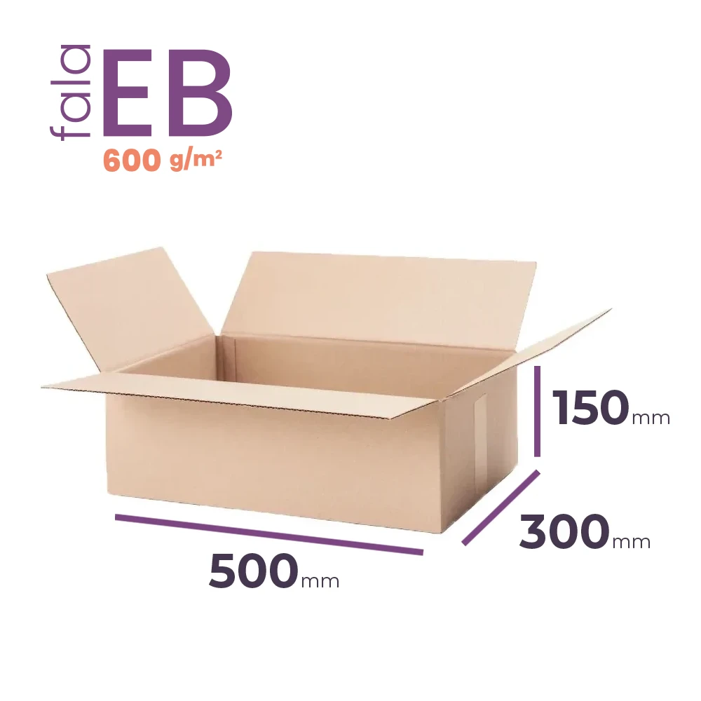 Karton klapowy o wymiarze zewnętrznym 500x300x150 mm to praktyczne i solidne opakowanie idealne do codziennego użytku w e-commerce i wysyłce produktów. Wykonany z mocnej 5-warstwowej tektury (fala EB, wysoka gramatura 600 g/m2), łączy w sobie funkcjonalność, trwałość i ekologiczne pochodzenie – potwierdzone certyfikatem FSC.