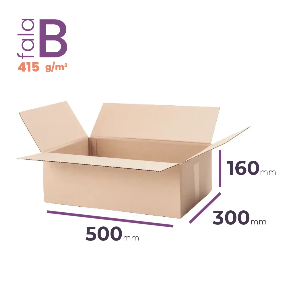 Duży karton klapowy o wymiarach zewnętrznych 500x300x160 mm to solidne i uniwersalne rozwiązanie do pakowania przedmiotów o większych gabarytach. Wykonany z trwałej, 3-warstwowej tektury (fala B, gramatura 415 g/m2), z certyfikatem FSC i pojemności 21,49 litra zapewnia wysoką odporność na uszkodzenia mechaniczne. Pakuj bezpiecznie delikatne i ciężkie przedmioty.