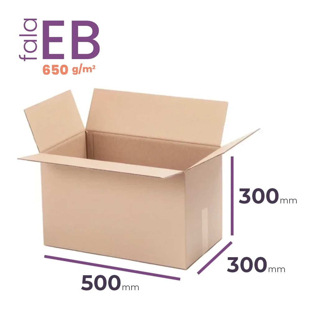 Karton klapowy o wymiarze zewnętrznym 500x300x300 mm to praktyczne i solidne opakowanie idealne do codziennego użytku w e-commerce i wysyłce produktów. Wykonany z mocnej 5-warstwowej tektury (fala EB, wysoka gramatura 650 g/m2), łączy w sobie funkcjonalność, trwałość i ekologiczne pochodzenie – potwierdzone certyfikatem FSC.