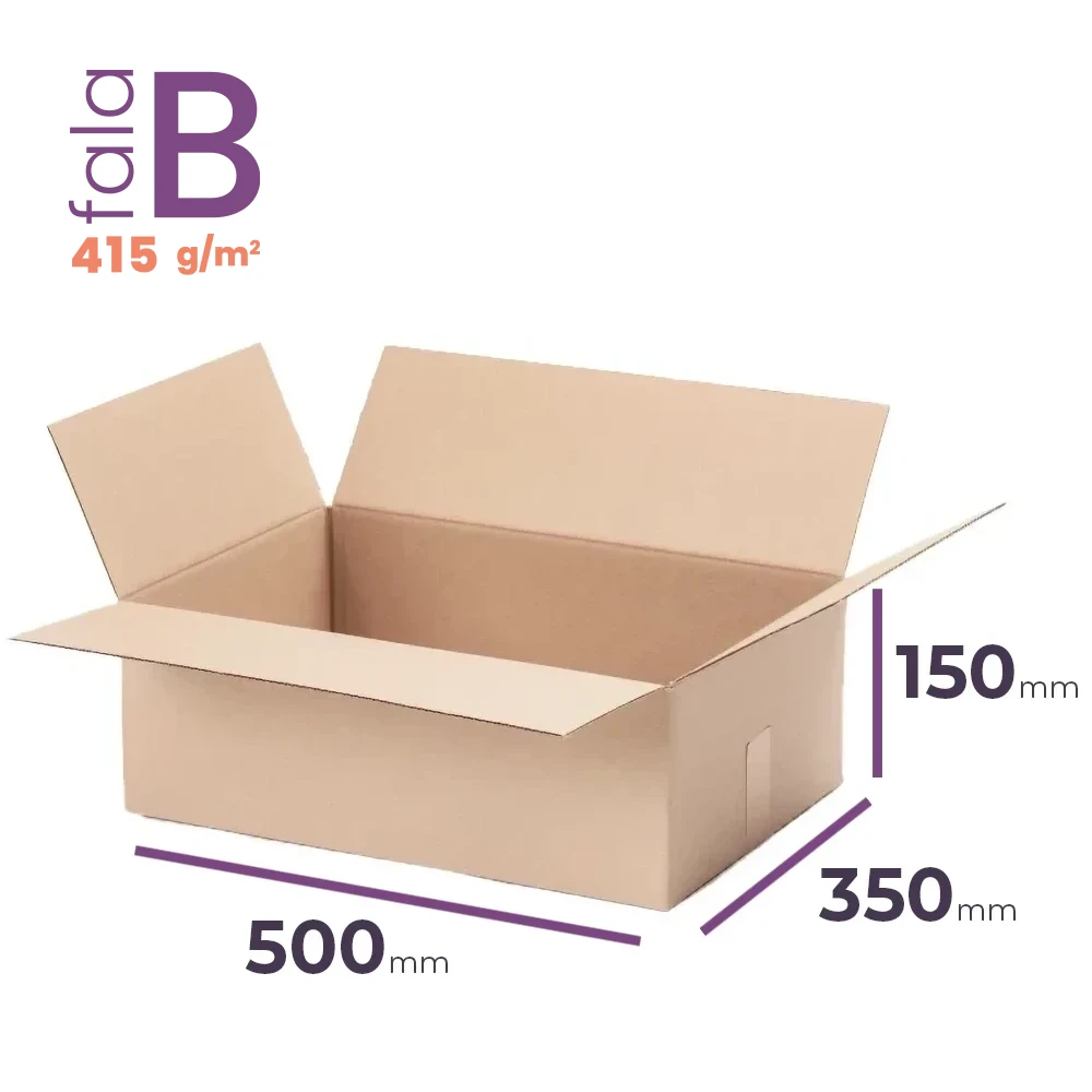 Karton klapowy o wymiarach 500x350x150 mm (wymiar zewnętrzny) to funkcjonalne, trwałe i ekologiczne opakowanie (certyfikat FSC), które doskonale sprawdza się w wysyłce większych, płaskich przedmiotów. Wykonany z 3-warstwowej tektury (fala B, gramatura 415 g/m2), karton ten gwarantuje odpowiednią ochronę zawartości w transporcie oraz estetyczny wygląd przesyłki. Spełnia normy dla gabarytu B InPost, M Orlen Paczka, M Pocztex, M DHL, a także pasuje do automatu DPD.