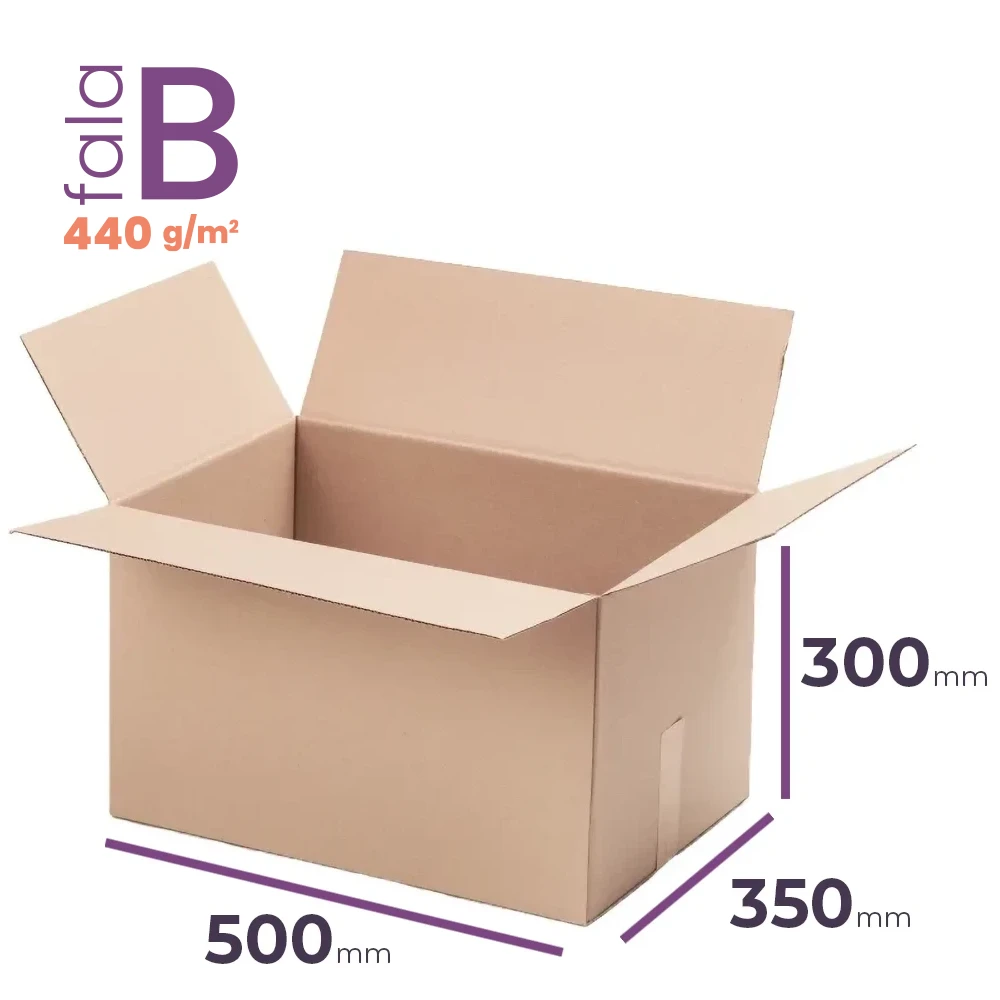 Karton klapowy o wymiarze zewnętrznym 500x350x300 mm to praktyczne opakowanie idealne do codziennego użytku w e-commerce i wysyłce produktów. Wykonany z 3-warstwowej tektury (fala B, gramatura 440 g/m2), łączy w sobie funkcjonalność, trwałość i ekologiczne pochodzenie – potwierdzone certyfikatem FSC.