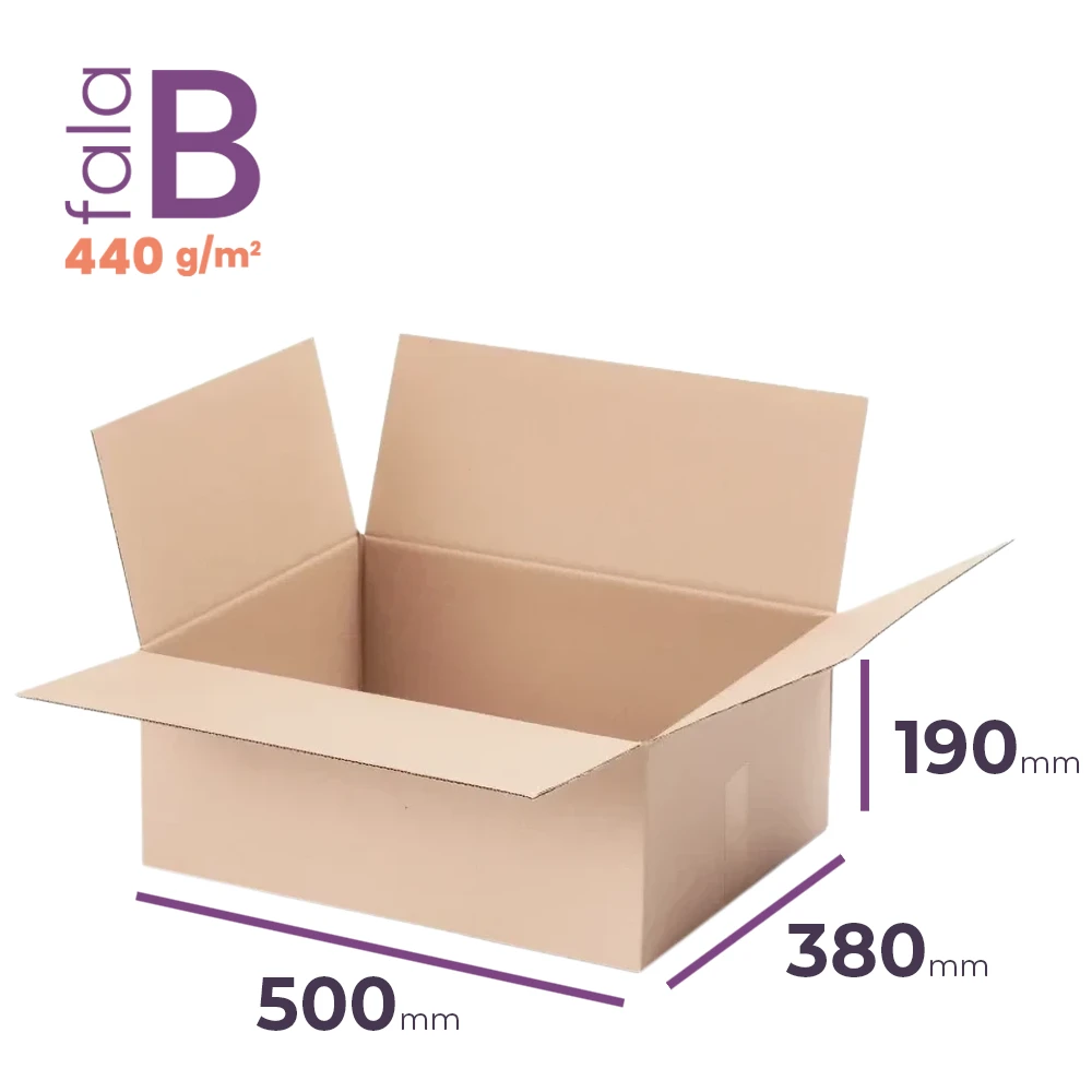 Szukasz solidnego rozwiązania do wysyłki ubrań, obuwia lub delikatnych przedmiotów? Ten duży, szeroki karton klapowy o wymiarach 500x380x190 mm wykonany z trwałej, 3-warstwowej tektury fali B - gramatura 440 g/m2, o pojemności 33,10 L z certyfikatem FSC to idealny wybór dla e-commerce.