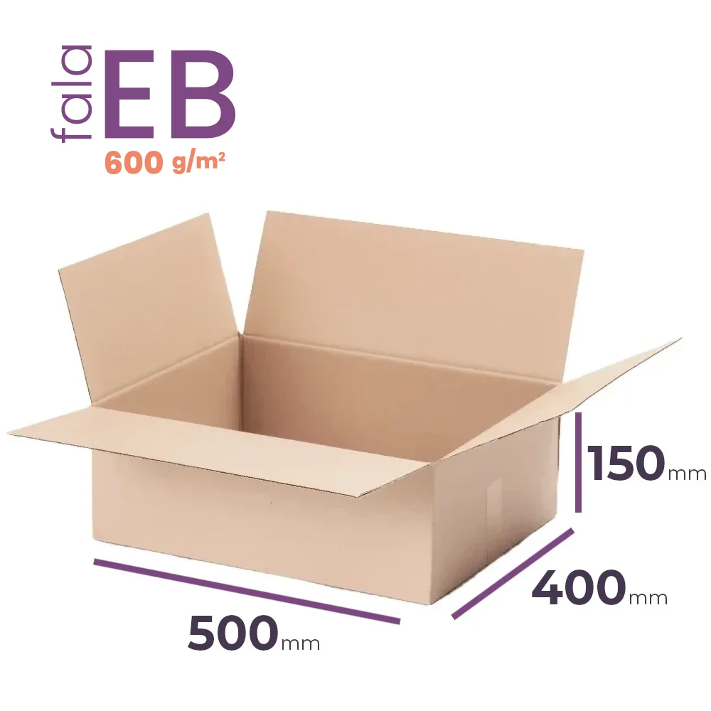 Karton klapowy o wymiarze zewnętrznym 500x400x150 mm to trwałe, ekologiczne i pojemne opakowanie, które idealnie sprawdzi się do wysyłki płaskich, średnich przedmiotów. Wykonany zgodnie z klasyfikacją FEFCO 201 z solidnej, 5-warstwowej tektury (fala EB, gramatura 600 g/m2), karton ten zapewnia odporność na uszkodzenia mechaniczne. Produkt posiada certyfikat FSC, potwierdzający jego ekologiczne pochodzenie.