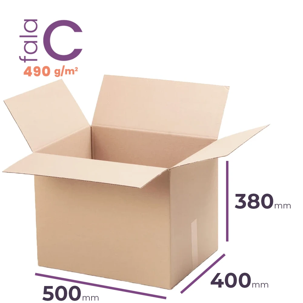 Karton klapowy o wymiarach zewnętrznych 500x400x380 mm to duże pudełko klapowe stworzone z myślą o bezpiecznym i wygodnym pakowaniu większych produktów oraz przesyłek zbiorczych. Wykonany z solidnej 3-warstwowej tektury (fala C) o wysokiej gramaturze 490 g/m2, gwarantuje odporność na uszkodzenia i nacisk. Posiada certyfikat FSC, a jego wymiary mieszczą się do automatów paczkowych Pocztex i DPD.