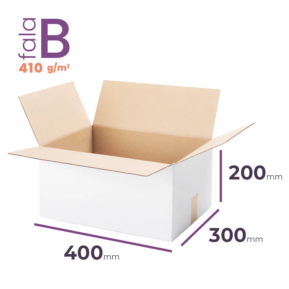 Biały karton klapowy o wymiarze zewnętrznym 400x300x200 mm to estetyczne i funkcjonalne duże pudełko klapowe, które świetnie sprawdza się przy wysyłce produktów wymagających eleganckiego opakowania. Wykonany z 3-warstwowej tektury (fala B) o gramaturze 410 g/m2, zapewnia odpowiednią sztywność i ochronę zawartości. Karton posiada certyfikat FSC i pasuje do gabarytu C InPost, L Orlen Paczka, M Pocztex, L DHL, a także do automatu DPD.
