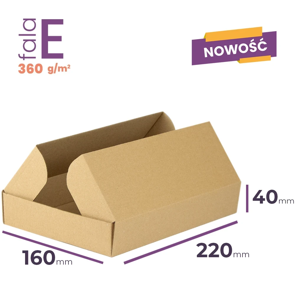 Szary karton wykrojnikowy 220x160x40 mm to wytrzymałe opakowanie stworzone z myślą o wysyłce niskich produktów. Wykonany z 3-warstwowej tektury falistej (fala E) o gramaturze 360 g/m2 chroni zawartość przed naciskiem w trakcie transportu. Bez problemu wyślesz w nim dokumenty, katalogi, cienkie książki, kalendarze, koszulki, akcesoria reklamowe, grafiki czy drobną elektronikę.