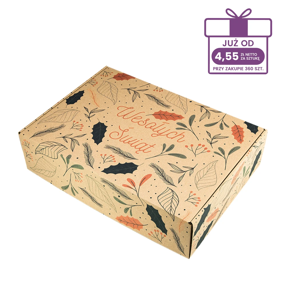 To pudełko świąteczne od razu wyróżnia się na tle tradycyjnych, czerwono-zielonych opakowań. Zamiast klasyki zastosowane zostały mocniejsze barwy w stylu retro, które dodają świeżości i nowoczesności. Całość zdobi subtelny, roślinny wzór, dzięki czemu karton fasonowy wygląda elegancko i nietypowo. Idealne sprawdzi się dla marek, które chcą pokazać swoją oryginalność! Tak zapakowane zamówienie to nie tylko skuteczna ochrona produktu, ale też bardzo efektowna reklama, która świetnie prezentuje się Twoim klientom. To prosty sposób, by wzmocnić wizerunek firmy!