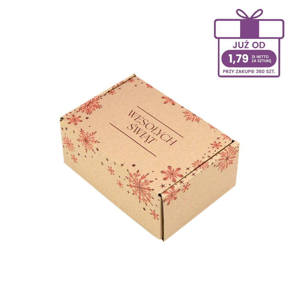 Świąteczny karton fasonowy z nadrukiem „Śnieżynki” o wymiarach zewnętrznych 160x110x70 mm to praktyczne rozwiązanie stworzone z myślą o sklepach internetowych, które wysyłają niewielkie lub elastyczne produkty, takie jak kosmetyki, akcesoria GSM, biżuterię, zabawki lub vouchery. Aby dodatkowo zabezpieczyć zawartość i nadać paczce elegancki wygląd, warto zastosować czarny wypełniacz ozdobny oraz biało-czerwony sznurek, który podkreśli świąteczny charakter przesyłki. W celu ochrony przed warunkami atmosferycznymi warto zastosować również foliopak.