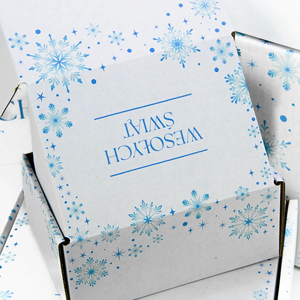 Świąteczny karton z nadrukiem „Śnieżynki” łączy tradycyjne motywy z nowoczesnym designem. Delikatne, niebieskie płatki śniegu nadają paczkom zimowy, bożonarodzeniowy klimat, wprowadzając w przesyłki atmosferę magicznych, rodzinnych chwil pełnych uśmiechu. Subtelne barwy i elegancki wzór sprawiają, że karton jest idealnym wyborem dla sklepów e-commerce, które szukają efektownych, świątecznych opakowań. To sposób, by wyróżnić produkty w grudniowym sezonie i zachwycić klientów wyjątkowym designem już od pierwszego spojrzenia.