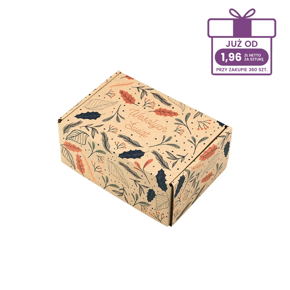 Postaw na pudełko fasonowe z nadrukiem "Świąteczny MIX", które w nowoczesny sposób interpretuje świąteczny motyw, roślinny wzór i retro kolorystykę, która ma się wyróżniać już na pierwszy rzut oka. Nietypowe dla okresu świątecznego barwy mają wzbudzić zachwyt klienta końcowego, który otrzymuje swoją przesyłkę. Dzięki temu Twoje paczka stają się awangardowe, przyciągające uwagę klientów i zachęcające do dzielenia się nimi w social mediach, co pozytywnie wpłynie na wizerunek Twojej marki.